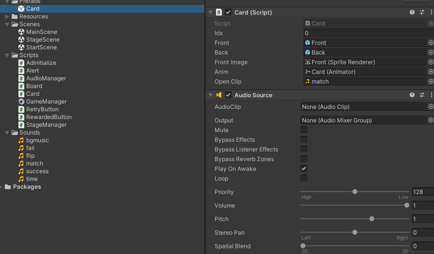 이렇게 생성한 변수를 OpenCard()에 넣어주면 되는데 사운드파일을 한번 재생하는 함수는 AudioSource의 PlayOneShot이라는 함수를 사용하면 된다. 다만 이렇게만 하면, 가져올 AudioClip과, AudioSource가 없으니, Card 프리팹의 Inspector창에가서 AudioSource를 추가하고, Card(Script)에 Open Clip변수에 Match효과음을 넣어준다.