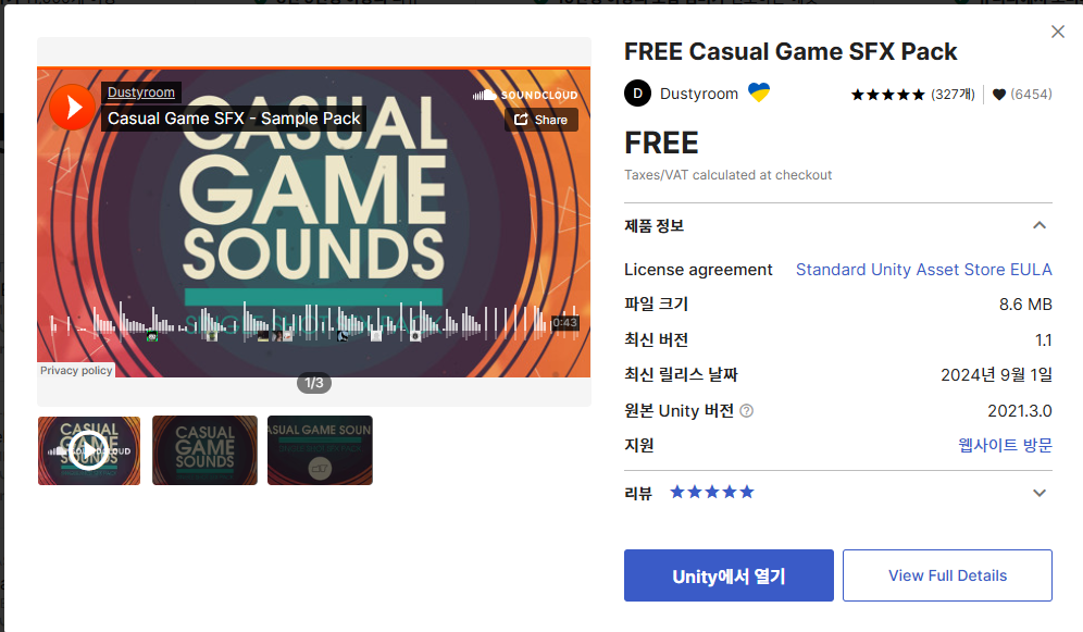 우선, 사운드를 찾기 위해 Unity Asset Store에서 무료에셋을 다운받았다.