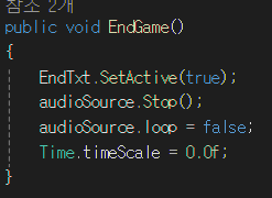 이제 게임이 종료되면 소리를 꺼줘야 하므로 EndGame시에 소리를 끄는 기능을 추가해준다.